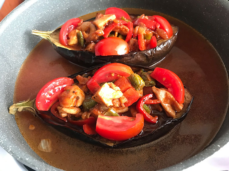 Bir tavaya 1 adet kuru soğanı, 1 adet kırmızı kapya biberi ve 3 adet yeşil sivri biberi yemeklik doğruyoruz. 1 çay bardağı sıvı yağ ile kavuruyoruz. Üzerine 3 adet kemiksiz kalça tavuğu sotelik doğruyoruz. Onları da çeviriyoruz. 2 diş doğranmış sarımsak ekliyoruz ve biraz harmanlıyoruz. Kenara ayırdığımız patlıcan içlerini minik minik doğrayarak içerisine ekliyoruz. 1 tatlı kaşığı tuz ve yarım çay kaşığı karabiber serpiyoruz. Biraz çeviriyoruz. Üzerine 3 adet rendelenmiş domates ve 1 tatlı kaşığı domates salçası ilave ederek karıştırıyoruz. 1 su bardağı su koyup bir taşım kaynayınca ocaktan alıyoruz.