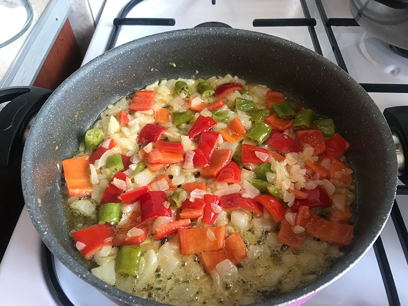 Bir pilav tenceresine 1 adet yemeklik doğranmış kuru soğan, 3 adet yemeklik doğranmış yeşil sivri biber, 1 adet yemeklik doğranmış kırmızı kapya biber koyup yarım çay bardağı sıvı yağ ile kavuruyoruz. Minik minik doğradığımız 5 diş sarımsak ilave ederek biraz çeviriyoruz.