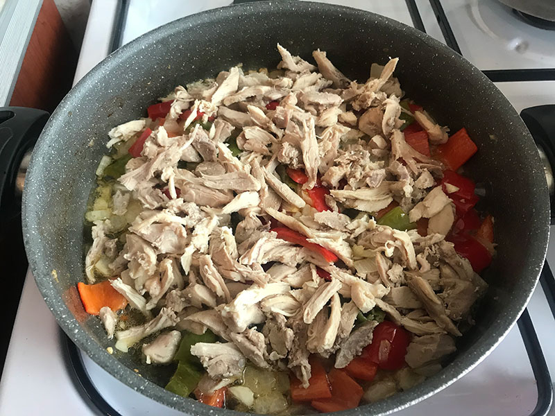1 dolu yemek kaşığı domates salçası ekleyip biraz çeviriyoruz. Üzerine didiklediğimiz tavukları ilave ediyoruz.