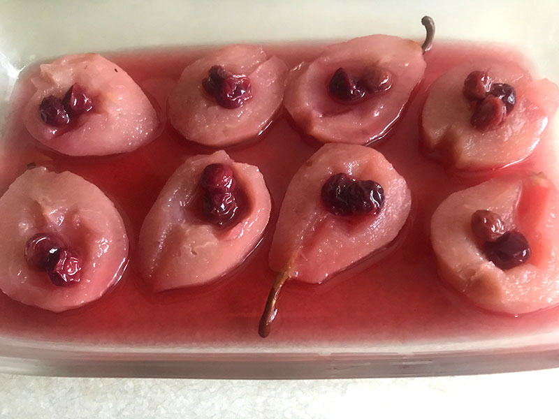 4 adet armudu yıkıyoruz ve soyuyoruz. Sap kısımlarını bırakarak ortadan ikiye bölüyoruz. Orta çekirdeklerini ayıklıyoruz. Bir pilav tenceresine ayıkladığımız armutları diziyoruz. Aralarına 1 su bardağı dondurulmuş vişne serpiyoruz. Armutların üzerine ikişer yemek kaşığı toz şeker döküyoruz. Armutların hizasına kadar su ekliyoruz. Suyuna da 3 yemek kaşığı toz şeker serpiyoruz. Kaynayınca ocağın altını kısıyoruz ve kısık ateşte armutlar yumuşayana kadar pişiriyoruz.( Pişirirken ara ara suyundan alıp armutların üzerlerine döküyoruz.) Pişirdiğimiz armutları bir cam fırın kabına diziyoruz.