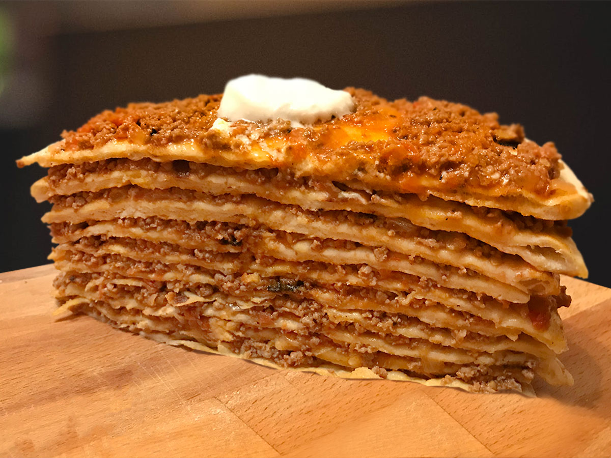 Beklettiğimiz hamuru 10 eşit parçaya bölüyoruz ve böldüğümüz hamurları yuvarlayarak bu şekilde üzerlerini örterek 10 dakika daha bekletiyoruz. Beklettiğimiz hamurları çukur tabak boyutunda merdane yardımıyla tek tek açıyoruz. Açtığımız hamurları teflon tavada ya da krep tavasında alt üst ederek pişiriyoruz. Pişirdiğimiz hamurların her katına hazırladığımız kıymalı iç harçtan koyarak bu şekilde 10 kat hazırlıyoruz. En üst kısmına da 1 yemek kaşığı sarımsaklı yoğurt ekliyoruz. Servis yaparken sarımsaklı yoğurt ile servis yapıyoruz. Afiyet olsun…