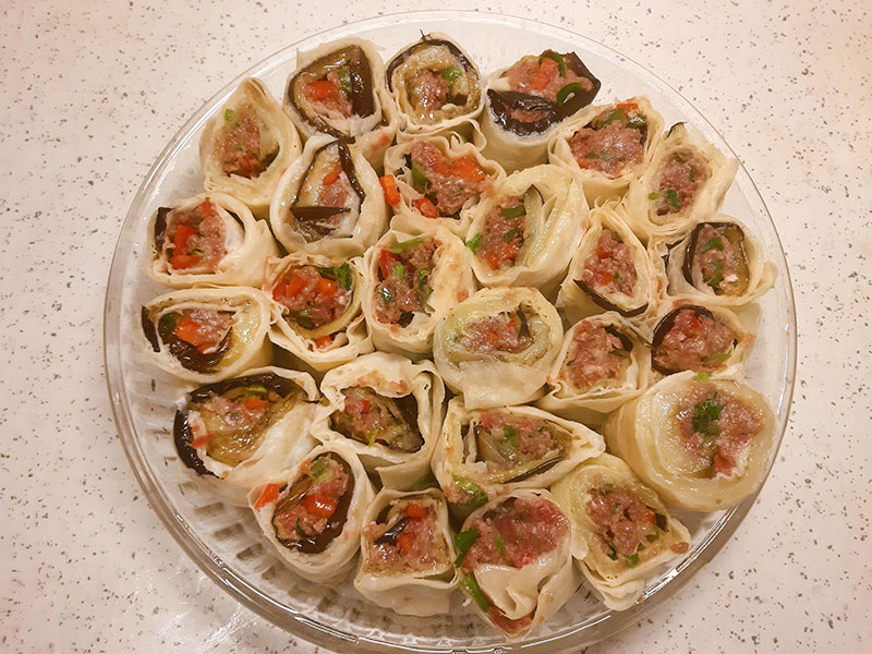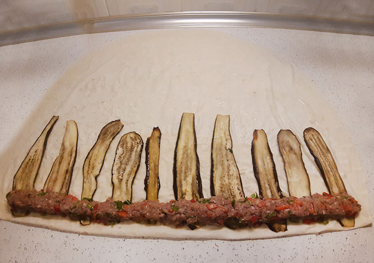 Patlıcanların uç kısımlarına hazırladığımız kıymalı harcın yarısını ince uzun şerit halinde yerleştiriyoruz. Yufkanın sağ ve sol kısmından iki parmak kalınlığında katlayıp rulo halinde sarıyoruz. Uç kısmına da hazırladığımız yağlı sudan fırça yardımıyla sürüp kapatıyoruz.