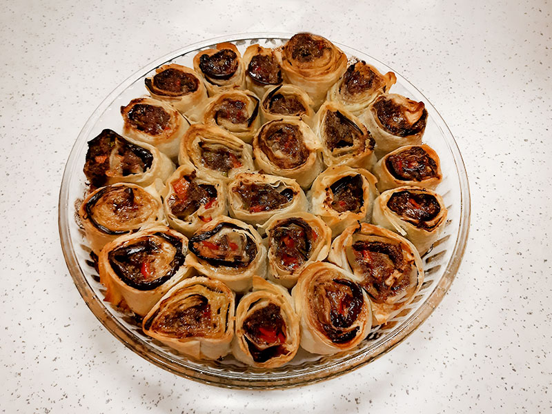 Diğer yufkayı da tezgaha serip kalan patlıcan ve kıymalı harcı kullanarak aynı şekilde hazırlıyoruz. Onları da fırın kabına diziyoruz. 190 derecelik önceden ısıtılmış fırında üzeri nar gibi kızarana kadar pişiriyoruz.