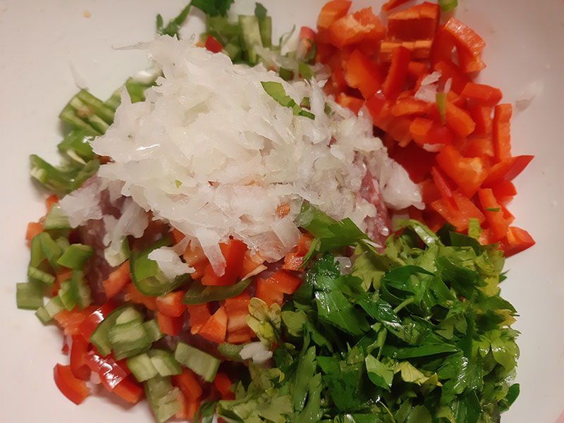 Patlıcanlar kızarırken biz iç harcını hazırlıyoruz. Bir kaseye 1 adet kuru soğanı rendeliyoruz. 250 gram kıyma ilave ediyoruz. 1 adet yeşil biber ve 1 adet kapya biberi çok ince şekilde küp küp doğruyoruz. 2 diş sarımsak rendeliyoruz. 3 yemek kaşığı galeta unu, 3 yemek kaşığı su ve 3 yemek kaşığı sıvı yağ ekliyoruz. 1 avuç maydanozu çok ince doğruyoruz. Üzerine yarım tatlı kaşığı tuz ve yarım çay kaşığı karabiber serpiyoruz. Tüm malzemeyi iyice birbirine yediriyoruz. Hepsi birbirine karışana kadar güzelce yoğuruyoruz. Hazırladığımız kıymalı harcın üzerini streç filmle kaplayıp 20 dakika buzdolabında dinlendiriyoruz.