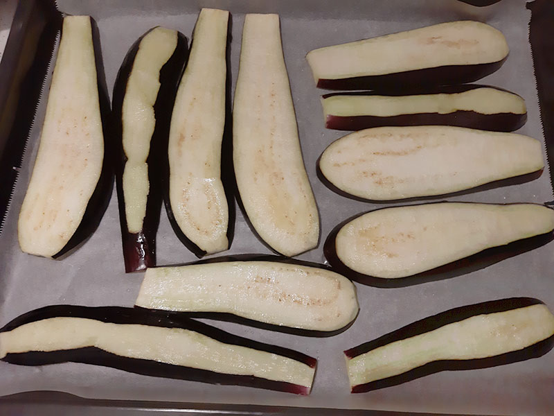 4 adet patlıcanın baş kısımlarını kesiyoruz ve ince olmayacak şekilde dilimliyoruz. Yağlı kağıt serdiğimiz fırın tepsisine aralıklarla diziyoruz. Üzerlerine fırça yardımıyla (altını ve üstünü) yarım çay bardağı sıvı yağdan sürüyoruz. 2 çay kaşığı tuzu eşit şekilde serpiyoruz. 200 derecelik fırında hafif pembeleşinceye kadar kızartıyoruz. (Çok kızartıp kurutmuyoruz)