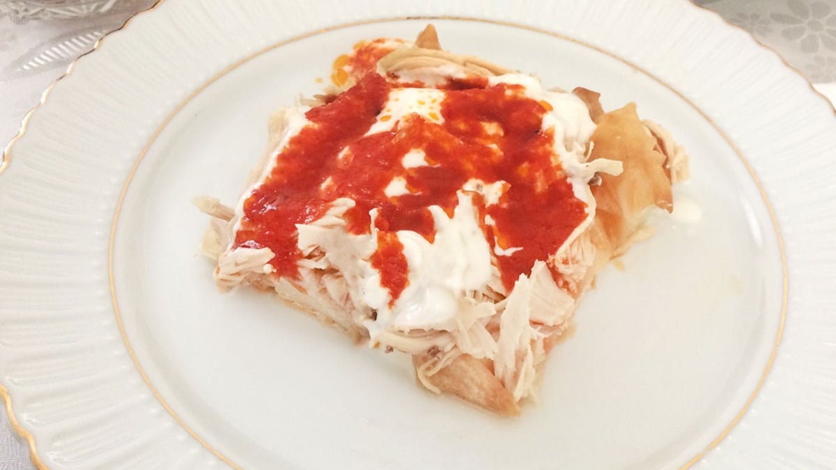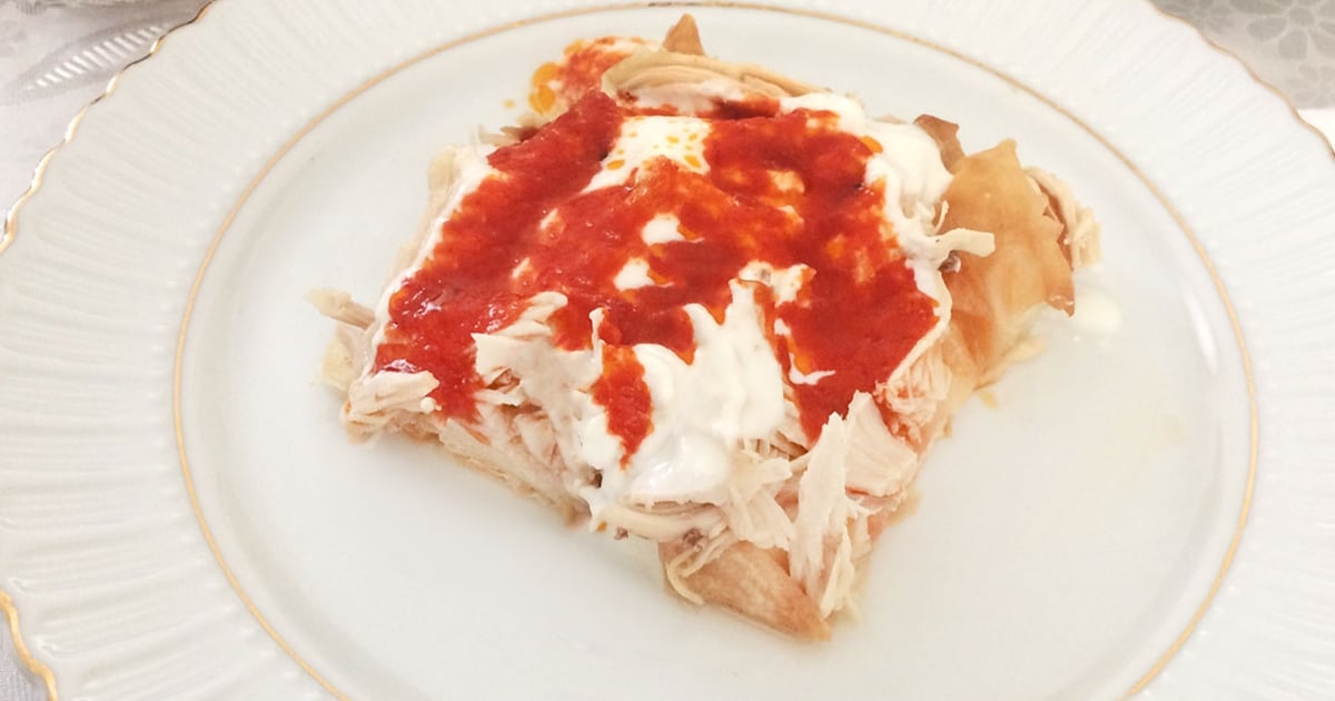 Kızarttığımız yufkaların üzerine didiklediğimiz tavukları her yerine gelecek şekilde dağıtıyoruz. Tavuk suyundan da 5 yemek kaşığı üzerine gezdiriyoruz. Üzerine de hazırladığımız sarımsaklı yoğurdu gezdiriyoruz. Yoğurdun üzerine de salçalı sostan her yerine gezdiriyoruz ve kare dilimler halinde keserek servis yapıyoruz.