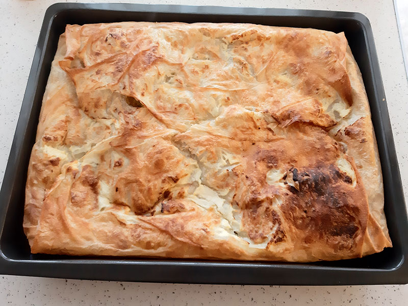 Kalan 2.5 yufkayı da aynı şekilde hazırlıyoruz. İlk koyduğumuz yufkanın kenarlarını üzerine kapatıyoruz. Kalan sosu da üzerine döktükten sonra 200 derecelik fırında pişiriyoruz. Afiyet olsun…