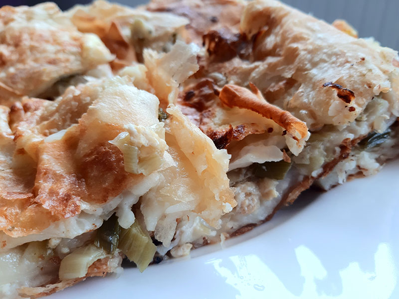 5 adet yufka ile yapıyoruz. Bir kapta 2 adet yumurta ve 1.5 su bardağı yoğurdu çırpıyoruz. Üzerine yarım su bardağı sıvı yağ ve 2 su bardağı su ekleyip hepsini karıştırıyoruz. 1 yufkayı fırın tepsisine dışa sarkacak şekilde serip üzerine karışımdan bolca sürüyoruz. İkinci yufkayı parçalayarak üzerine ekliyoruz. Tekrar malzemeden döküyoruz. Yarım yufkayı da bu şekilde yaptıktan sonra hazırladığımız pırasalı malzemeden üzerine döküyoruz ve yayıyoruz.