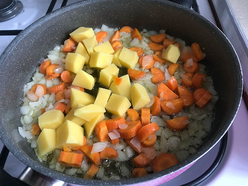 1 adet yemeklik doğranmış kuru soğan ve 1 adet yarım ay şeklinde doğranmış havucu bir pilav tenceresine alıyoruz. 2 yemek kaşığı sıvı yağ ve yarım çay bardağı zeytinyağı ile kavuruyoruz. Üzerine 2 diş rendelenmiş sarımsak ekliyoruz. 1 adet küp doğranmış patates ilave ediyoruz. Onları da biraz çeviriyoruz.