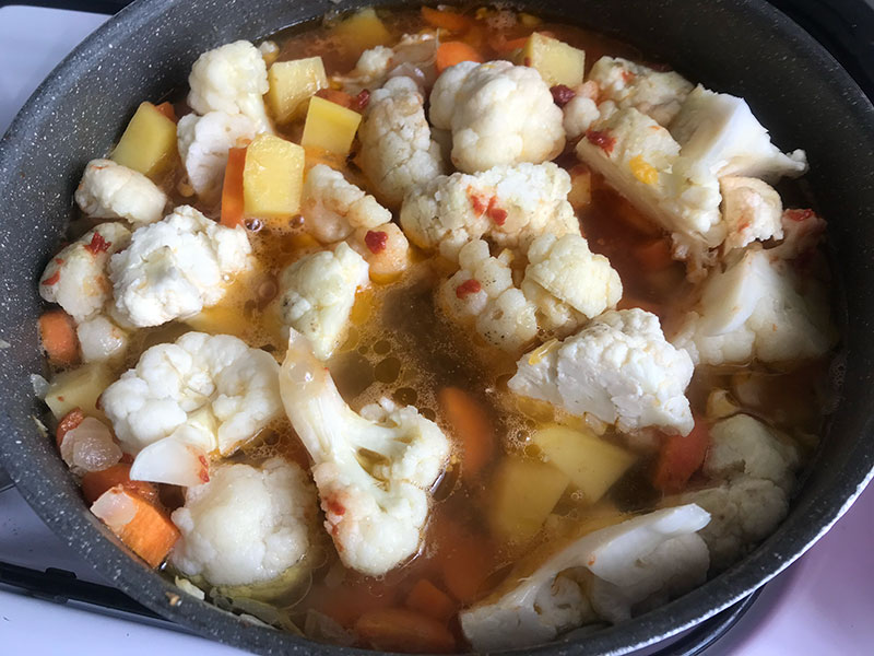 1 yemek kaşığı domates salçası ekliyoruz ve biraz çeviriyoruz. Üzerine çiçek çiçek ayırdığımız 1 adet küçük karnabaharı alıyoruz. Üzerine çıkmayacak kadar su ekliyoruz.