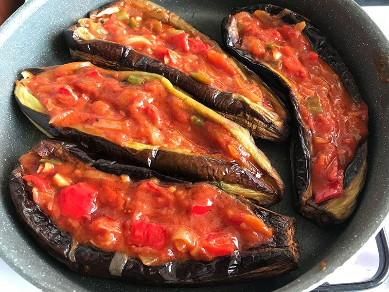 Hazırladığımız domatesli harcı kızarttığımız patlıcanların içerisine dolduruyoruz. Patlıcanların üzerine çıkmayacak şekilde su koyup kısık ateşte pişmeye bırakıyoruz. Afiyet olsun…