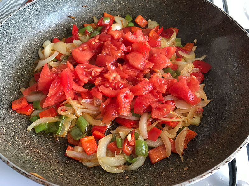 Bir tavada 1 adet jülyen doğranmış kuru soğan, 2 adet yemeklik doğranmış yeşil sivri biber ve 2 adet yemeklik doğranmış kırmızı kapya biberi yarım çay bardağı sıvı yağ ile kavuruyoruz. Üzerine 4 adet rendelenmiş domates ilave ediyoruz ve biraz çeviriyoruz. Üzerine 3 diş küçük doğranmış sarımsak ekliyoruz. Onu da biraz çevirdikten sonra 1 tatlı kaşığı tuz ve 2 adet kesme şeker ekleyerek domatesler yumuşayana kadar pişiriyoruz.